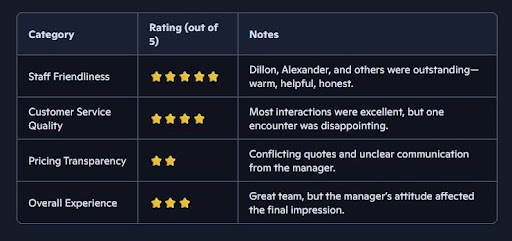 Over the course of my visits, I interacted with four employees, though I regret not remembering the names of two of them. Each one was professional, polite, and consistently wore a smile, which is rare these days. Their warmth and attentiveness left me with a tremendously positive impression of the shop.