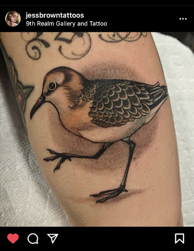 This was my first time in the studio, and I can say without reservation that 9th Realm Gallery is the single nicest, cleanest, most inviting studio I've ever had the pleasure of visiting. I worked with Carly because I loved her creative illustrative style and the sense of momentum in her work. We had a brief consultation where she matched my excitement, was clear and thorough about the process, timing, and expectations. Day-of, the young lady at the front desk (whose name I did not get) was awesome, checked on me on an hourly basis to see if I needed anything. Carly was awesome and so much fun to chat with throughout our five + hour session. Her work speaks for itself, and plenty of artists of her skill level could absolutely carve you up and get away with it, but she thoughtfully and carefully staggers work, uses clever techniques to manage pain, and checks in to make a very complex tattoo feel absolutely attainable in a single session.