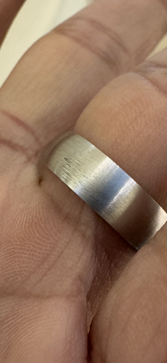 A week and a half later, we received an email saying the ring was ready for pickup. We drove 50 minutes to the store, only to immediately notice a scratch/imperfection on the ring. Margaret offered to clean or send it for buffing, but since we had 30 days to try it out for fit, we decided to take it home.