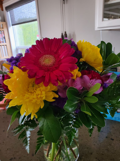 This week, I made an arrangement that needed a little white for my friend in nursing rehab. Returning the container, I brought in my nearly-finished arrangement, wondering how they would react. Once again, super friendly and helpful...amazingly so, in fact! I was on my way to deliver them, so he let me finish arranging them right there. Offered to clean the stems first, don't worry about the mess, offered a box to transport, and even changed the water with flower food! Despite most of the flowers bought at the grocery store! I was treated with respect and kindness.