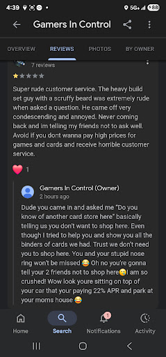 I'm giving it a one star because I'm frustrated with the fact that I brought a friend to spread the word and to support Gamers in Control and the interaction that day was embarrassing. How can people support your shop if they cant browse what you sell? After 3 years I wont be supporting this shop...