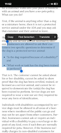 Service Animals A service animal is legally defined in Human Services Article, §7-701, Annotated Code of Maryland as a guide dog, signal dog, or other animal individually trained to do work or perform tasks for the benefit of an individual with a disability. The task(s) performed by the service animal must be directly related to the person’s disability. Service animals are allowed to accompany their owners, even in places that don’t allow pets. Service animals can enter public buildings, restaurants, shops, hospitals, schools, and hotels. For example: A restaurant offers indoor and outdoor seating. A person arrives at the restaurant with a service dog and asks to sit inside. The restaurant cannot require the person to dine outside because of the service dog. Emotional Support Animals Service animals whose sole function is to provide comfort or emotional support do not qualify as service animals under the ADA or in Maryland law. Emotional support animals, therapy animals, or support animals that do not meet the Health General, §7-701 definition of a service animal are not allowed in food service facilities under COMAR 10.15.03 (except in outdoor dining spaces under the Outdoor Dining and...