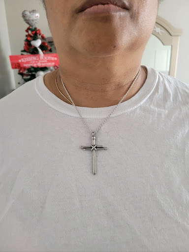 Read moreHad been looking for a white gold rope chain for my middle son for his birthday. I found one online at Kay Jewelers so I ordered it and scheduled it for in-store pickup. The pickup day was Valentine Day so upon entering the store I noticed that it was beautifully decorated with pink and red heart decor nothing to grand but still enough to enjoy. The sales team greeted me with what sounded to be in unison a hearty hello and welcome to Kay's. To which I responded almost laughing "Hi." As I made my way to one of the jewelry counters a very nice sales lady who's name I failed to get assisted me. She was friendly, quick, and knew how to do her job. She asked how she could assist me so I told her that I was there for an online order in-store pickup. She then asked for my ID and used a hand held device to look up my order once she was able to confirm that I indeed had an order she handed me my ID back and informed me that she would be right back. Well she then went to retrieve my purchase and in a few seconds or so she was back. She opened the box to show me my purchase to make sure I was receiving the correct item and that I still wanted it. Once I confirmed that it was in fact the correct item and that I did want it she placed the item back in the box and went to retrieve a bag for my purchase. She placed my purchase in the bag and also added a piece of red tissue paper which I'm sure they were doing with all purchases that day as it was Valentine Day. But I still thought it was a nice touch. She then handed me my purchased item with a cheerful "can I help you with anything else today?" to which I responded "no thank you this is all" she wished me a good day, thanked me for my business, and invited me back. When I got home I wanted to see what the necklace would look like with the pendant I purchased from Amazon so I added the pendant to the chain put it on and had hubby snap a pic. I think...