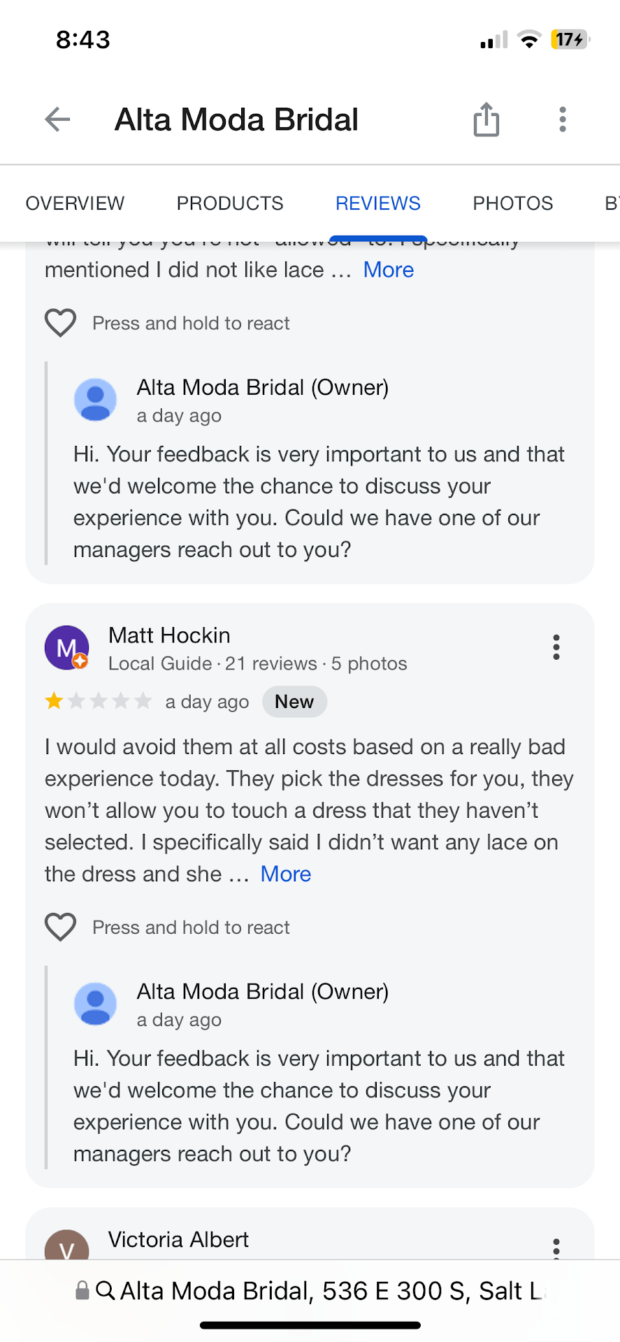 The warmth and personal interest that is extended to customers who have given 4-5 stars is obviously a cater that we did not experience at Alta Moda from Lexie and Collette. I am sincerely disappointed in our experience and will not accept a cliche apology.