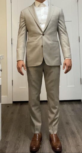Although the the suit arrived just in time, Cody, out of all people, was the person who was helping me try on my suit. He told me it fit fine, despite me noticing significant sleeve pitch and unevenness in the sleeves (the photo speaks for itself). I'm assuming Cody let me walk out of that store without alterations was out of spite.