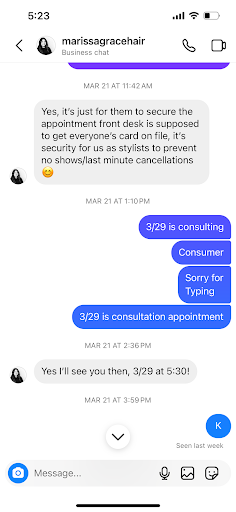 Original review - 3/29 I have to give one star because there is no less available. Extremely unprofessional staff. I came in for hair color consultation, some weeks ago with Amber. But during my consultation I didn’t felt comfortable with some of her comments, but I ignored those and confirmed the appointment for hair color.As soon as I walked downstairs I had a question to ask and I went upstairs. She refused to answer my query even for a minute- right after appointment was booked. I was not convinced thereafter and then I cancelled my appointment. I found another stylist Merissa and contacted her via instagram. She confirmed consultation for 3/29 @5:30 for which I have saved chat as well so that they cannot refuse, I just wanted to confirm once again if she is in salon so I called at salon. I was surprised when desk person told me that she can’t take me because she took someone else and there is no appointment for me. Just to make sure I visit the appointment , I didnot go anywhere on my weekend and because of her I had to cancel many other things. Not just that, the staff is arrogant enough to not to apologize as if it’s only one salon in the whole city. I asked them to have my call forward to the owner which they refused because the staff thinks that they are owner and can decide whatever they want.on behalf of owner. Both times I felt the smell of racism. Now, to secure their time they have the card details so that if client doesnot show up they deduct money from card. In my situation, they refused my appointment at the last minute, will they pay me...
