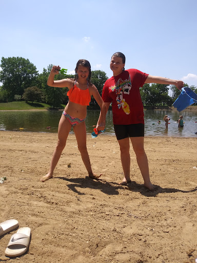 Classic swimming hole with shallow area roped off, playground, picnic seating, raft in the middle of the pond, diving board, etc.
