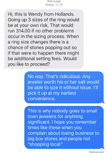 We went in to get my husband's wedding ring buffed down due to rough spurs that had formed on the steel over time. Evan (sp?) helped us and she took the ring back right away to get it done. While the jeweler was working on his ring, I asked her to look at a ring I had been given years ago to see whether it was a glass "stone" or a gem. She took it to the back and when she brought it back up, it was BEAUTIFUL! She had cleaned it and I had never seen it look like that. We waited about 20 minutes and my husband's ring was done. I was very impressed--this will be my jeweler from now on. Evan has a great welcoming...