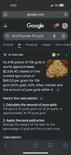 Warning ⚠️ stay away, I brought in my Gold here and my Gold was worth almost $3000 dollars and the lady offered me $1400 the most she could do. I quickly said no that ain’t working for me Gold is very high and I had about 56.608 grams of gold which at that day September 8 Monday Gold was $48.20 per gram for 10k, equaling $2636.40. I’m not stupid I did my research 🔬. Not only that my gold had diamonds which is where I added $464 dollars for my diamond which was a on my bracelet and ring. So I continued to walk away and she stated, “what could I agree to”?, I said posible $2800 or $2900 she said no that’s way too high. I said ok I’ll go check another spot out. So I left and found another “We buy Gold” store near by and he gave me $2500 for my Gold and that my friends is why you should always shop around. Never fall for the scam when they tell you, “ Sorry that’s to high and we would have to pay for the melting of the Gold, We are very honest with our people, ETC ETC” she wanted to pocket almost $1600+ from me, because she could have sold it for more because of the diamonds, the only honest she was being is how badly she wanted to scam me. Scam scam scam, you have...