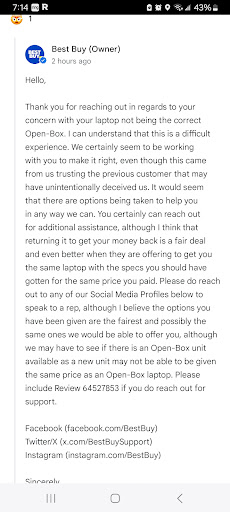 Read moreI bought this Dell - XPS 15 15.6" 3.5K OLED Touch-Screen Laptop - 13th Gen Intel Evo i9 - 32GB Memory - NVIDIA GeForce RTX 40601TB SSD - Platinum Silver. However, upon picking it on this past Friday (Black Friday), I noticed that the actual specifications on the laptop were not as advertised. I was given a laptop with 16G Ram and 512ssd, not the 32G and 1TB as advertised. After speaking with chat, i was informed to return to the store, and I did. After 3 hours at the store. Come to find out, apparently when a customer returned this laptop (hince the open box) the associate took the customers word for it regarding what was being returned and didn't check the specifications, I checked. Apparently, a customer bought 2 laptops and returned the lesser 16G, saying they were returning the 32G, and the associate never confirmed what they were taking in from the customer. Now, they don't have a comparable laptop in "open box status" they are willing to swap that has the same specifications without me paying more for the same specs on a different computer. I spoke to a Mgr at the North Park (North Star) store, and she was willing to order and add 2x16G ram sticks in a week. But not the 1TB I was looking for. I'm trying to turn my art hobby into a business, and this was going to be my "workhorse." Everything is out of pocket, so I'm always looking for a good deal, and I found one. However, Bestbuy DID NOT do their due diligence, and now I have to pay to make them whole as opposed to Bestbuy honoring their offer. I said at least upgrade the hardware, YOU offered the deal not me, I just accepted it now they want to change your offer saying "We can add it for an additional cost (at store) but store associate aren't as willing to make monetary adjustment or admit they failed to fact check their items upon return. They said they have other "open box" 32G's but not at the cost I got this one for, which is fine but not my fault. Give me one of the "open box" ones even if it costs YOU more, not ME. It's YOUR FAULT at this point. Had you caught it before you could have blamed the other "customer." I shouldn't be penalized or have to pay more for what was offered at the price I paid or take less than what was offered for the same price I already paid. So BestBuy screws up, and I have to either pay more than what they asked for or take less than what was offered. Something has to give, and i'm not quitting on this one, f-that.... P.s. Tommy. BestBuy did not offer the same or an equivalent replacement. Only a refund, as I mentioned above. Which is NOT fair because you're not held accountable, and I don't get what I am offered and paid for. And attention to detail. I've since reached to theu instagram and they offered a...