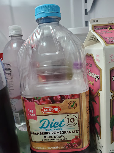Update: 9/36/2023. H-E-B carries numerous tasty fruit juices, including their own brand, including Diet Cranbury Pomegranate, my favorite. However, there is one serious problem which is pictured with this post. In at least the last two or three years, the blue plastic screw bottle cap has been defective. I estimate I purchased at least 10 bottles, and only once, I was unable to simply unscrew the cap the usual way. The other times, I've had to take a serrated knife and cut along where the cap should normally separate from the bottle. The one time it unscrewed normally was my second to last purchase; but this last time, the cap was even worse than usual. As far as I can tell, the Diet Cranberry Pomegranate bottle is the only one with the cap issue. I urge H-E-B to solve the problem. BTW, it's not my own arm strength; I do two Cross-fit workouts each week.