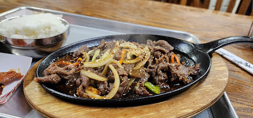 The Food When they called me to the counter a sizzling iron skillet of bulgogi, cooked with onions and carrots was waiting, a bowl of rice, and sides of beansprouts, kimchi, carrots & cucumbers, and and an item I had not tried before and couldnt identify. (I've since been told it was probably dried squid in red chile)