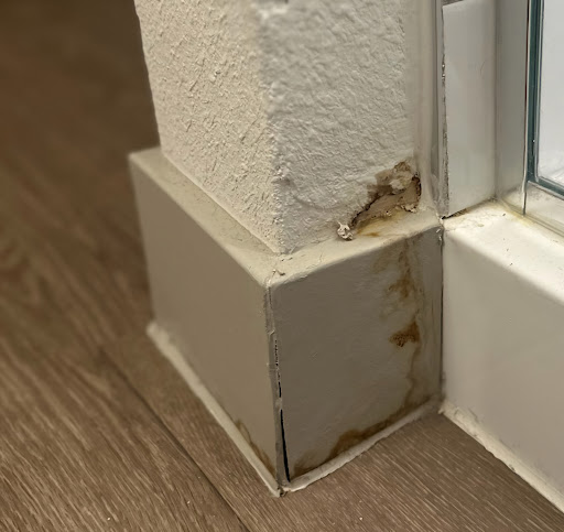 Moreover, there is mold in the bathroom where water leaks onto the drywall and baseboard. When I attempted to clean the drywall, it just deteriorated. The flooring where the water leaks is warped. The walls on both sides of the shower are like this, but much worse now.