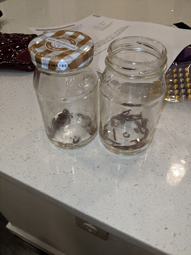The jar on the left is from Tuesday morning's 4 am bug safari (5/28) and the jar on the right is from this morning's 2 am roundup (5/29). Bugs were scooped up with an index card in less than 30 minutes Monday night/Tuesday morning and within 15 minutes this morning. Seriously. For funsies, zoom in and try to count them and remember these were just there ones from the inside--i didn't bother with anything outside. They'll probably be here shortly...