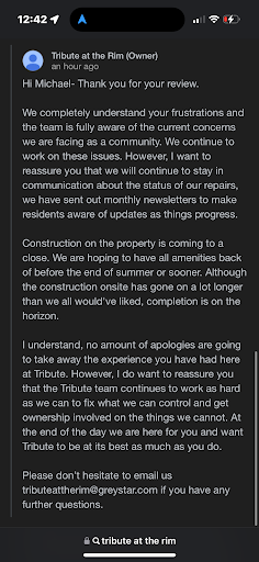 Hereās my main message to management: If you would just be transparent about whatās going on it would be less frustrating for residents, no more corporate generated responses. Just tell us what the problems are, why theyāre still happening, and why they arenāt being fixed. Better yet, just give us some regular updates on the progress of things! I would much rather get a weekly email saying āthe part for the garage doors is still in transitā or āthe replacement railing is on back order, weāll update you when itās in.ā than never hear anything about it. Heck, make it an optional newsletter for the people who might be annoyed at getting the emails!