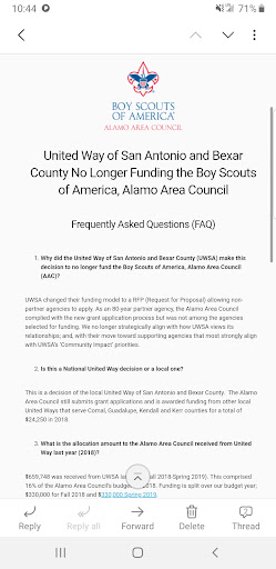 Read moreAfter 80 years of partnering with the Boy Scouts of San Antonio, the United Way no longer believes in the goals of Scouting. We live in a time when conserving our natural resources, training young people to be new leaders, and understanding citizenship is so desperately needed. And now, the United Way of San Antonio thinks we DON'T need those things? Well, if the United Way can't support the cherished conservation, leadership, and citizenship values of Scouting, don't expect my support any longer. What an awful example you are setting for the young people of...