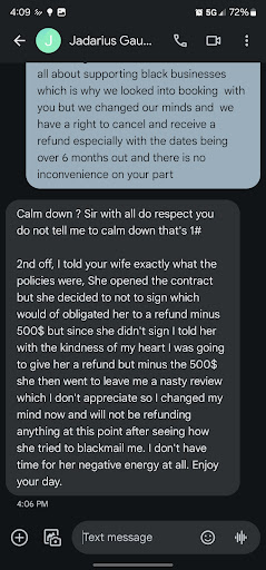 I normally dont write reviews, but i definitely want to warn others !!! BEWARE OF THIS VENUE, THEY WILL ROB YOU OF YOUR MONEY . Although I will say the venue looks beautiful from videos, I don't actually know what it looks like in person. Owner Jadarius Gause is very pleasant until he his not . I spoke with MR.GAUSE about reserving a date in May and explained we would pay the deposit in two payments. Mr.Gause agreed and let us know that the date was not officially booked until the 2nd payment, completing the deposit, was made, and the contract was signed. He said he sent over the contract to be signed . The contract was not sent over until 8/28/24 after I requested a refund bc we are canceling the event . Mr.Gause stated that per contract, he would be keeping 500 out of 768 because the contract states that cancelation within 60 days is entitled to all money minus 500 . We are canceling events 9 months out and have only had event booked less than 2 weeks, and there is no signed contract. Mr.Gause is stating that he is not refunding me any money as I sent money over without a signed contract . All of these are through text messages. I even asked Mr.Gause if he would give us back 384 as that would be fair to both parties, and he refused and stated he would pray for my suitation and wasn't giving me any money back. Mr.Gause took the time to respond to this and stated he is refunding me 268, yet I have messaged him several times asking when I should expect my refund and have not gotten a response. Mr.Gause, I would appreciate it if you informed me of when and how I will receive my refund.As of 8/29/24 I have reached several more times asking when can i expect my refund and how will it be returned. Mr.Gause has completely stopped responding, although he responded to this review, saying he was giving me a refund. The entire conversation from 8/26/24, 8/29/24, and the contract that was sent over to be signed on 8/28/24 after I requested a refund has...