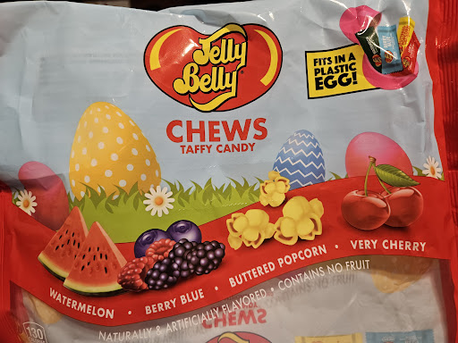 I'm very irritated after purchasing Jelly Belly Chews taffy candy. The label shows four flavors, including "buttered popcorn", which I fondly remember from the original jelly beans of my childhood... I was excited to share with grandkids, but lo and behold, in the package of about 40 pieces, only ONE is the buttered popcorn flavor. Very disappointing. I'm sorry I wasted my money, because there are plenty of other brands of fruity flavored taffies to choose from. I wish remember that next Easter. Speaking of which, the bag of candy I purchased also boasts, "Fits in a plastic egg!" They really need to specify what size plastic egg, because I'm getting more irritating by the minute as I sit here trying to smash these things...