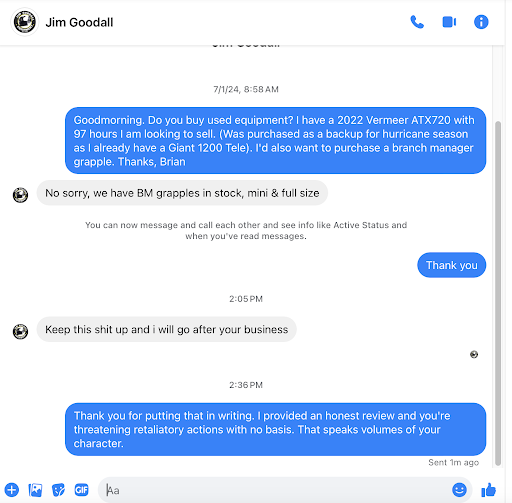 We needed a new Harley Rake for our business and after a bit of searching none were to be found in the Midwest. I came across an ad on the internet and quickly called Jim Goodall Equipment and found that they had one in stock. Our experience was above and beyond expectations. Jim answered the phone and helped with making sure we had everything we needed to make the attachment work for our machine. After the rake arrived I realized I hadn’t ordered the wiring harness for our machine (Kubota SVL95)and when I called back to order that, Jim explained that he took care of it and sent it with the attachment. I was not expecting this at all so when we need another attachment Jim will be the first (and last) call I make! Great people and great...