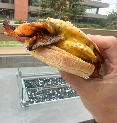 I ordered a dirty chai, which was excellent, and their Classic Camino breakfast sandwich with bacon. The bacon is “millionaire’s bacon” — sweet, spicy, and absolutely delicious.