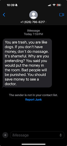 Read moreMy sister used a Groupon on here and it was a horrible experience. The woman was so pushy and so aggressive about a tip but refused to listen to go softer when she asked. It almost seemed like the staff was not actually trained to massage they were massing so aggressively and rough. There were no essential oils used like advertised and the stones were not the same as advertised either. When my sister didn’t leave a tip because the massage was so horrible the woman yelled at them, chased them out and texted my sister calling her a dog and a bad person for not leaving a tip! Massage was FULLY paid for but the woman was angry about not being given a tip. A tip is NOT mandatory it is given for a job well done when in this case it was not!!! DO NOT COME HERE!!!! I attached photo of the text the massage woman left! She pressured my sister into give a tip that she did not deserve so my sister felt she had to tell the woman in it was the room so she would let them leave! Horrible horrible i would never recommend this spa. Extremely unprofessional and look at the other one star reviews all the same complaints there’s...