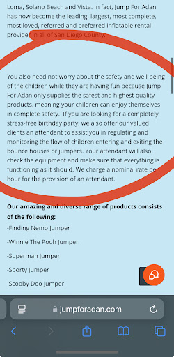 I would strongly advise against using this jump house company. Especially given their website specifically stating, "You also need not worry about the safety and well-being of the children while they are having fun because Jump For Adan only supplies the safest and highest quality products, meaning your children can enjoy themselves in complete safety."