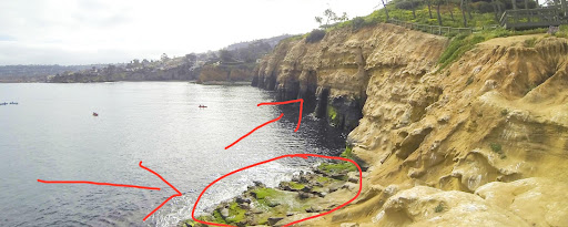 Then I saw a second wave forming â even larger than the first. It was only a few seconds away, and I could tell it was going to slam directly off of the rock ledge and sweep me into open water. No life jacket, no fin. And worst of all - the current was pulling toward the dark caves that the company had told us to explore. If that wave had carried me off the rocks, I would have been dragged straight into them. (See image attached).