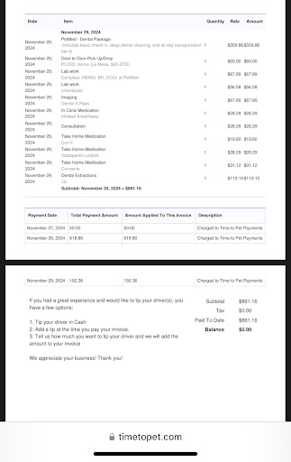 Soon after being notified that my dog passed, I received 2 separate invoices for the charges. Both of which had different total amounts, with no explanation about the discrepancy. Not long after that, I received a text message from the billing department saying my final invoice was ready for payment. I get the need to be on top of charging clients, but receiving multiple messages to pay right after my dog died came off as a bit insensitive.