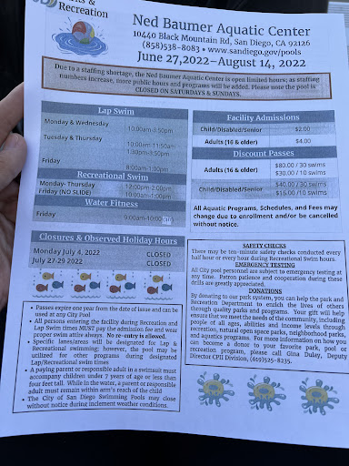 Read moreBy far my favorite public pool in San Diego. Lap swim is separated from the recreational swim AND the kiddo pool. The water is by far the most clean for the public pools. Locker room is huge and clean. Staff very friendly. Downside is hours can be very limited outside summer as it is the college swim team pool.