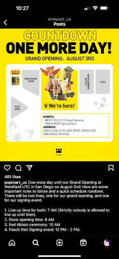 Ā Ā Ā Read moreI'm super upset and definitely giving a 1-star rating to this store because of this. I followed the rules on this post, which said that the line-up starts at 7am and strictly no one can line up before then. I got here at 6:30am, and people were already in line. Additionally, I saw a lot of people cutting the line with the staff bringing them straight into the store without getting in the main line with the people who in the short line for Peach Riots. I arrived at 6:30am and had to wait until 2:34pm to get in, and everything| wanted was sold out. So what is the meaning of this post? I came from LA, driving down to SD early in the morning, excited for this celebration, and waited 8 hours for nothing. If u already have people who u wants sell the stuff to then don't post this about the time and rules for who wants to buying stuff, i just feel like u used the people who follow the rules to get u free advertising about people in line to get...