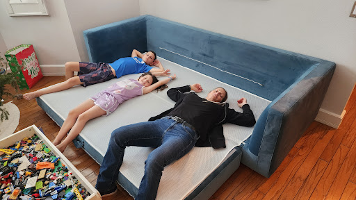 I grabbed an Uber after work and arrived an hour before closing. The showroom had several sleeper sofas, one being the Milo Sleeper. A sales rep named Samara helped me out, letting me fold it out and lay on it while having a video call with my wife. She showed me all the material options and sizes and after a bit of back and forth, I walked out with a digital quote for the large 98" in Solstice color (blue velvet).