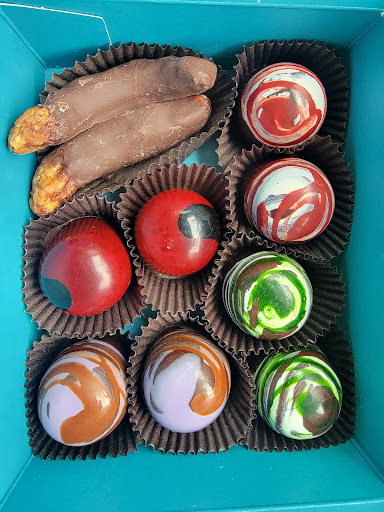 We were warmly greeted by Lena who enthusiastically showed us around the shop and explained where they get their cocoa beans and we marveled at the amazing machinery roasting the cocoa and churning the glistening pools of dark chocolate. We're delighted at the great array of colorfully decorated chocolate bonbons. We picked out for pretty bonbons and then another two. Lena arrange them in a beautiful box and offered us some hot chocolate that she had just made for herself. She was so kind and gracious and the chocolates were incredible. When we got them home we couldn't believe how pungent the flavors were. The passion fruit seems like we're just sucked it right from the shell. The sea salt caramel was super salty in a really good way. This is dark dark chocolate, and not especially sweet so you can really taste me pure flavor of the cocoa bean. We can't wait...