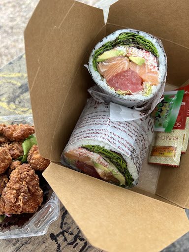I ordered the chicken kaarage and Mt Fuji sushi burrito. The chicken kaarage had a bit too much breading, but it was still good. I’ll probably opt for the oysters or takoyaki next time. The burrito was huge! They did not skimp out on the salmon and tuna. Since I don’t like spicy mayo, I asked to have that replaced with the eel sauce. They did omit the spicy mayo, but I couldn’t really taste the eel sauce. Nevertheless, the burrito was well constructed and delicious. Definitely a great bang...