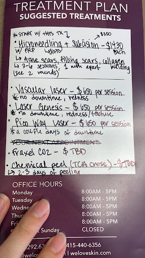I originally came to Bay Area Dermatology to treat my cystic acne that I’ve been struggling with since I was a teenager. I made an appointment with Dr. Hui and when I visited I was escorted to a room and was seen by Dr. He. He recommended that I tackle my acne with a round of accutane and then treat my acne scars with the treatments listed in the image I provided. It was a perfunctory, detached appointment, but I felt like he understood what I was trying to do to get my skin back on track.