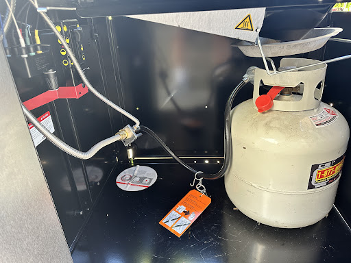 Photo shows the barbeque cabinet with propane tank installed on the wrong side.