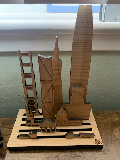 Instead, you can see the wooden San Francisco skyline I purchased a year ago, which they are still selling to this day. It features the Salesforce Tower, Transamerica Pyramid, 181 Fremont, Golden Gate Bridge, Russ Building, Ferry Building, Coit Tower, City Hall, DeYoung Museum, and Legion of Honor Museum, and can be rearranged to your liking.