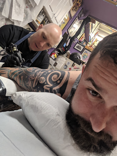 Great tattoo shop, went from concept to shin sleeve in a month. Love the piece and I get compliments all the time, Brian does great work! I do have one suggestion/nitpick. The same 12 classic rock songs on Pandora were great for the first 2 hours but after spending ~18, not so much. People getting tattoos in San Francisco probably won't be offended by a little variety. Seriously, I'd rather lobotomize myself with a butter knife than hear Fortunate Son one more time. Jokes aside I would 100% go there again and recommend the place it has a great atmosphere, but a little miles davis, 90's alternative, and hell even some Kendrick Lamar would...