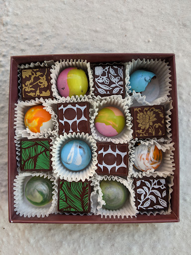 Their chocolates need some work. They are currently all the same size and shape. The designs look cool, but they are all standard transfer sheet designs. Iād love to see some brushed designs, different shapes, and maybe even some free form truffles. The chocolates I received tasted good, but they had imperfections. They were not flat on the bottom and there were small air bubbles.