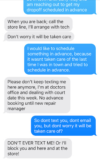 The phone wasn't picked up, the advance booking website thing was completely ignored, so I used the text number I had available to try to clarify next steps. I was brushed off, told to call the store, or use the website, while trying to set a dropoff in advance and simply trying to figure out what my next steps were while trying to respect the erratic owner's requests.