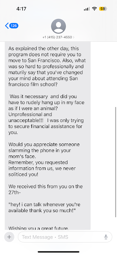 As a potential student who was once excited about the possibilities ahead of him in this industry, he's now trying to understand why anyone would want to go to this school. To be honest, if she wouldn't have insulted both of us, I was more than happy to let her know that he's very sick and would never hang up on someone like that, he's the sweetest human on the planet.