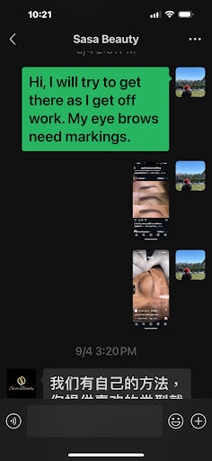 Tonight, we met up with SaSa at her shop. What an angry woman she was… like she was doing us a favor to meet up with us. We called the shop before meeting with her. She didn't bother to see what's going on with my eye brows, not admitting her sloppy job. We don't like the way how she was constant talking over us. I am a busy person and I have up coming vacation and holidays are coming up and I have no time for this type of mistake !