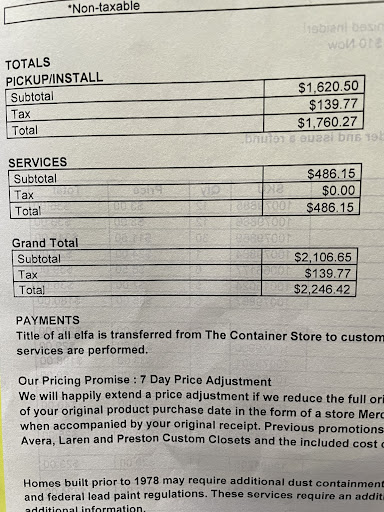 Read moreDO NOT SPEND MONEY HERE!!!!! I ordered a custom closet design build for my closet in a new unit. I spent $2,000+ on parts and professional installation and they messed up my order FOUR TIMES and had me drive to the store TWICE after the told me all my parts were ready for pickup, over and over and over again I was missing parts as they kept telling me they had everything and the professional installers couldn’t finish the job from all the missing parts. This 2 week wait time is turning into TWO MONTHS … AND their internal system says they sent all the parts and now my closet is half built and they can’t tell me if they will even send the rest of the parts. WORST CUSTOMER EXPERIENCE IVE EVER HAD PERIOD. I’ve kept every receipt and every piece of paper and they don’t even know what parts they are missing! I’ll be send a formal letter to senior mgmt and corporate to complain. Update: finally after I requested multiple times to speak to a manager the real manager called me and told me simply and precisely what went wrong and how he will fix it, literally all I was asking for - a plan of action. I will update again after they “make it...