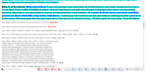 Read moreIf you are interested in vintage Atari, then you know about Best Electronics. No doubt it would be an interesting visit to their store to view the bazillions of vintage Atari parts. Brad has been very helpful in providing advice on repairs and parts, like making sure you have a 1050 diagnostics disk for when you want to replace a track zero sensor in a drive. Anyway, I have been able to repair devices with parts from Best, and it is great they are still...