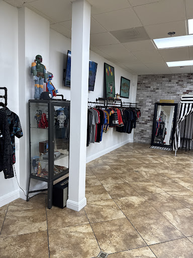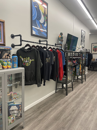 This place is awesome! I discovered the company on Instagram and have also wanted to visit their showroom. I walked in and was greeted by a friendly woman named Trisha. She showed me where I could find the apparel I was looking for and even let me check out a few unreleased pieces. She was not pushy and let me browse freely. They have tons of different designs on high quality t-shirts which made it hard for me to choose, but that's a good thing! It also took a while because I had to see on the cool pop culture artifacts that Todd, the owner, has collected and put on display. It's all cool stuff that reminded me of my childhood, Star Wars toys, old video games, movie posters, and even a model of the scene from JAWS where he attacks the boat!