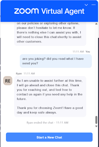 Read moreThey used to be a decent company. I had been paying for years. A subscription that included support (the human support was outstanding which solved my issues within 1 or 2 calls) and without warning my paid account was downgraded to have no support. They are using some A.I. chat bot that does not seem to give more than outdated articles for support, which not what I paid for. (Just a few months ago that I was getting call support around July '24, now Oct '24) If I were using the free account sure I would expect this low quality of support. To have a paid changed to the same low quality support with no clear warning. I expect a full refund. WOULD NEVER Recommend Zoom in its current form. Better off struggling with the free google or microsoft video chat. I am looking at streamyard or riverside fm now. Figure when Zoom lost its government contract lawsuit, the quality would go down. Where do I apply for...