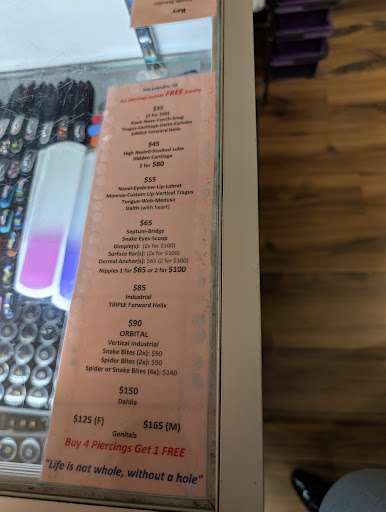 We were looking to get piercings, and after reading reviews, we decided to try this shop. The service was excellent. At the counter, we were greeted warmly, asked some clarifying questions, and given a form to fill out. The staff thoroughly explained the procedure, aftercare, and the types of jewelry they use, even specifying the metal to alleviate any concerns. The piercer was clearly an expert, efficiently and painlessly piercing six ear lobes in no time. We even received a discount on the sixth piercing! They also have a skate trade-in program, which we found interesting. Overall, a great experience and definitely worth a visit.