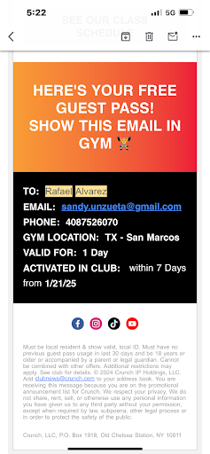 Read moreI have been a member since Crunch San Marcos opened last year. I’ve enjoyed the classes, the staff, and the overall vibe. Recently I made the leap into trying personal training, and I could not be more grateful! I see Coach Laney once a week, and it has changed EVERYTHING for me!