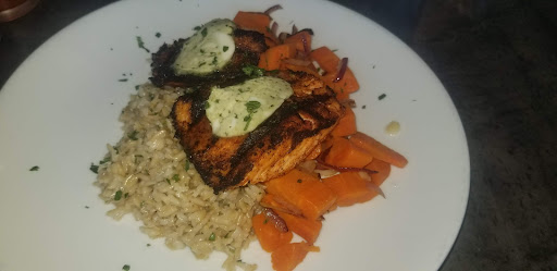 We enjoyed it so much we came back Saturday after the kids soccer game. I had the Hot off the grill Salmon with brown rice and vegetables (I requested all carrots). It was a blackened salmon that was cooked perfect. The had beef tacos that looked delicious. I did not have any as I am not a fan of sour cream.