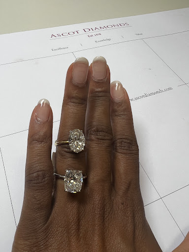 Contrast this to Ascot… there wasn’t a display of diamonds or jewelry to overwhelm you, it was quiet, not an overly heightened sensory experience, and I was in a private space. Valeria already pulled several options based on our email communication and in less than one hour we were able to select the most ideal cut for my hand, my size, band width, the carat range, color and clarity that is best for me. Valeria took notes on details that I was most sensitive to (details I didn’t know I cared about), and allowed me to look at the flaws in several diamonds via a magnifying glass. At this point I feel like I can educate others on diamonds and I walked into Ascot knowing almost nothing even though I visited 3 jewelers prior.