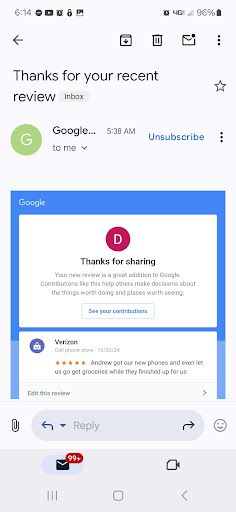 Read moreDON'T BELIEVE ANY OF THE 5-STAR REVIEWS FOR THIS LOCATION! Here's why: we went into the Sandy Verizon store 2 weeks ago to upgrade to new phones. After we'd selected and paid for the new phones, the representative told us that the data transfer from our old phones to the new ones "could take up to 50 minutes, so feel free to leave and come back." We took him up on it and left for 25 minutes, then returned and wrapped up. Yesterday I checked my emails, and was startled to come across an email from Google thanking me for my 5-star review of the Verizon store in Sandy. The twist: I NEVER REVIEWED THEM. On October 20th, the day of my visit, the representative took it upon himself to get on my phone after I'd briefly left the store, and leave himself a 5-star review on Google. And it's clearly not an isolated incident. NO local cell phone store has 4.9 stars and almost THREE THOUSAND REVIEWS. This is clearly something they do often, and a huge invasion of their customers' privacy. I did not tell them they could do anything on my phone except transfer my data. Hugely unethical. Think twice before giving this store your business. Posting a screenshot of what the review said before...
